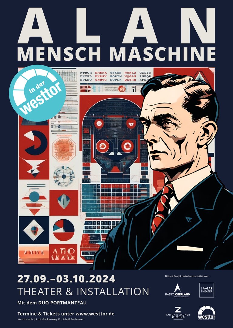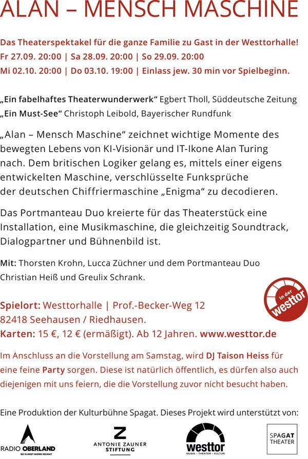 Christoph Leibold, Bayerischer Rundfunk・・Elektronisch-mechanische Wunderwerke! Die Geräuschkästen von Portmanteau bilden die großartige Sound- und Schaukulisse für die Theaterprodukion "Alan - Mensch Maschine" der Kulturbühne Spagat (...). Gelungener Mix aus Bio-Pic für die Bühne über den IT-Pionier Alan Turing, Spionage-Thriller und Reflexion über die Macht der KI. Ein Must-See in München. Von und mit Thorsten Krohn, Lucca Züchner, Taison Heiß und Greulix Schrank.