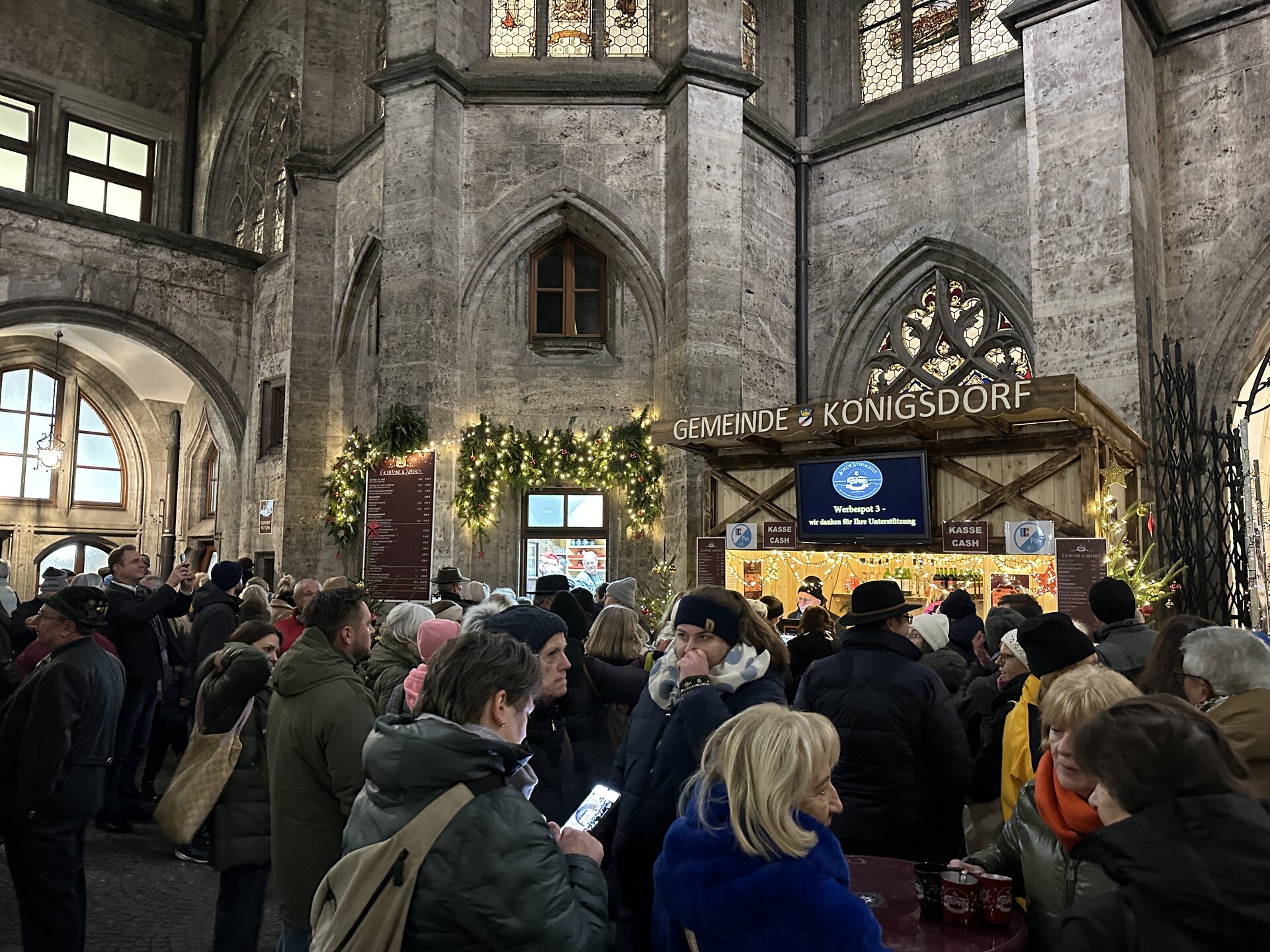 Und genau diesen Zusammenhalt und die Freude spürt man auch am Glühweinstand den die Gemeinde anlässlich der Spende im schönen Innenhof des Münchner Rathauses betreiben darf. Am Eröffnungstag bestand die Mannschaft aus Mitgliedern der Arbeitsgruppe, die seit über einem Jahr an all den Details – von der Baumsuche, über die Baumbesichtigung und Speisen- und Getränkeauswahl bis hin zu den Tassen und Schürzen und unzähligen weiteren Kleinigkeiten – feilte. Alle weiteren Tage wird bis 23.12. immer ein anderer Königsdorfer Verein den Dienst am Stand wahrnehmen und die Besucher von nah und fern in den Genuss von allerlei Spezialitäten aus Königsdorf und vor allem in den Genuss der Königsdorfer Begeisterung und Weihnachtsvorfreude kommen lassen. Der Erlös aus dem vierwöchigen Betrieb des Standes kommt den engagierten Vereinen im Dorf zugute und wird sicherlich auch wieder für wunderbare Projekte in der Gemeinde eingesetzt. Wann welcher Verein am Stand ist, Eindrücke von Baumfällung und Anlieferung und der eine oder andere Blick hinter die Kulissen am Glühweinstand gibt es immer aktuell auf der Website des Königsdorfer Gesamtvereins www.gemeinde-koenigsdorf.de