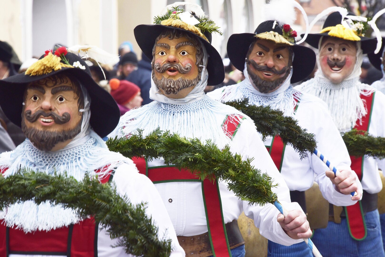 Pünktlich um 14 Uhr klingeln am Faschingssonntag die Schellen der Murnauer Maschkera durch den Untermarkt. Hier starten die 13 Schellenrührer mit ihren in kunstvoll geschnitzten und Larven, um nach alter Tradition den Winter zu vertreiben. Genau 13 dürfen es sein, für jeden Monat im Jahr einen plus einen Vortänzer. Allesamt Männer und einheimisch, so schreibt es die Tradition vor. Vermutlich hat das auch seinen guten Grund, denn das Schellenrühren braucht Kondition: schließlich wiegen die Schellengürtel etwa 15 Kilogramm. Und die bringen die Schellenrührer mit jedem Sprung zum Klingen. Linker Schritt, rechter Schritt, alle im gleichen Takt. Der Vortänzer gibt den Takt vor und wieget dabei mit jedem Schritt den halbrunden Bogen aus Eibenzweigen über seinem Kopf hin und her. Die 12 hinter ihm bewegen die Eibenbogen vor ihrer Brust von links nach rechts.