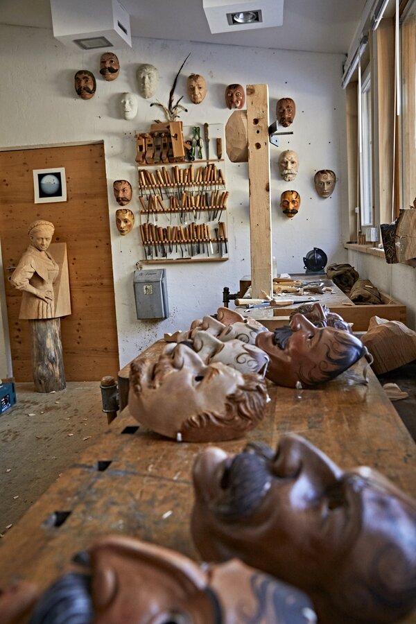 Sicher haben die Geigenbauer auch dazu beigetragen, dass es hier im Ort viele wertvolle „alte“ Larven gibt. Sie wird übrigens nur vor dem Gesicht getragen. So entsteht ein Resonanzraum, der dem Sprechen mit verstellter Stimme ein geheimnisvolles Flair verleiht. Doch in Mittenwald gibt es nicht nur eine Menge alter Larven, einige sind auch nach alter Tradition nachgeschnitzt. Einer, der diese Schnitzkunst beherrscht, ist der Kunststudent und Holzbildhauer Anton Ostler. Schon als Kind hat er angefangen im Schuppen der Eltern erste Larven zu schnitzen. Diese Leidenschaft ist bis heute geblieben und der ausgebildete Holzbildhauer ist so geschickt, dass er plant, davon zu leben.